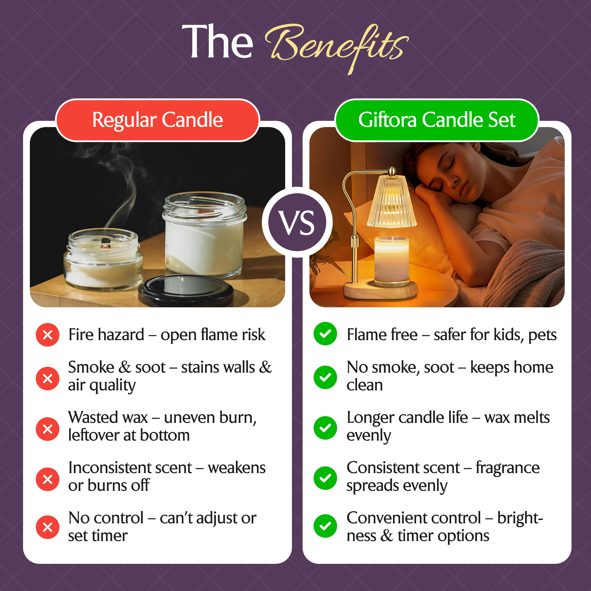 🎁 Candle Warmer Lamp Gift Set with Scented Candle – Unlike standard wax melt lamps, Giftora includes a premium 340g scented candle (Lavender, Rose & Lemon, or English Pear & Freesia). A thoughtful gift for women who love candles, or a ready-to-use decor piece for yourself.